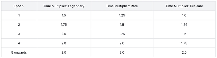 Resetting the Multiplier: In the absence of any actively running strategy at the beginning of an epoch, the multiplier is reset to its starting value. So as an example, a Rare NFT would return to having a Time Multiplier of 1.25x after a reset.