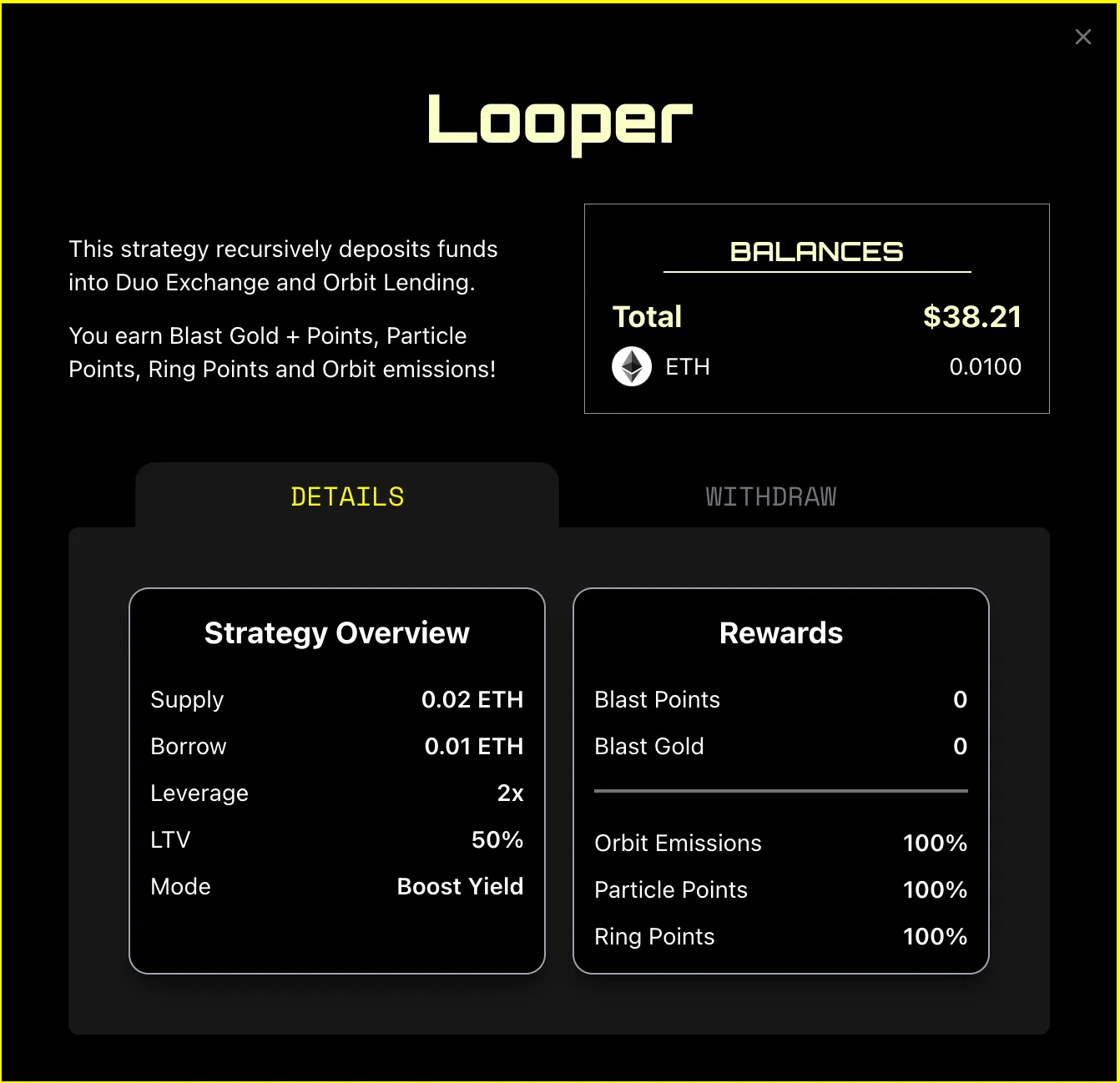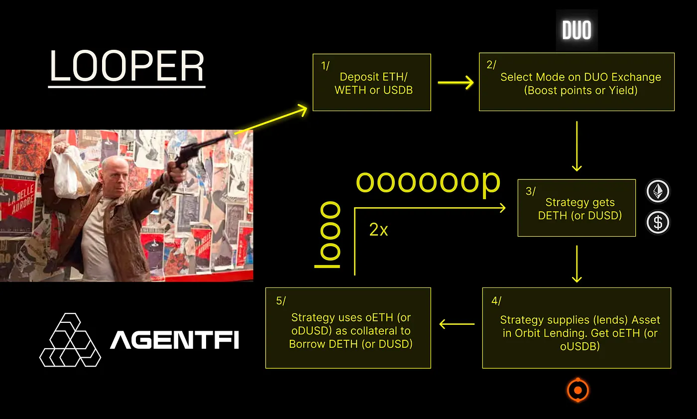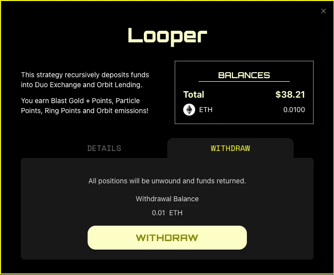 * Users deposit ETH or USDB - the strategy then mints DETH (or DUSD), lends it to Orbit Lending to earn rewards (points), borrows DETH (or DUSD) against the supplied position, and re-lends it on Orbit to earn **more rewards**!