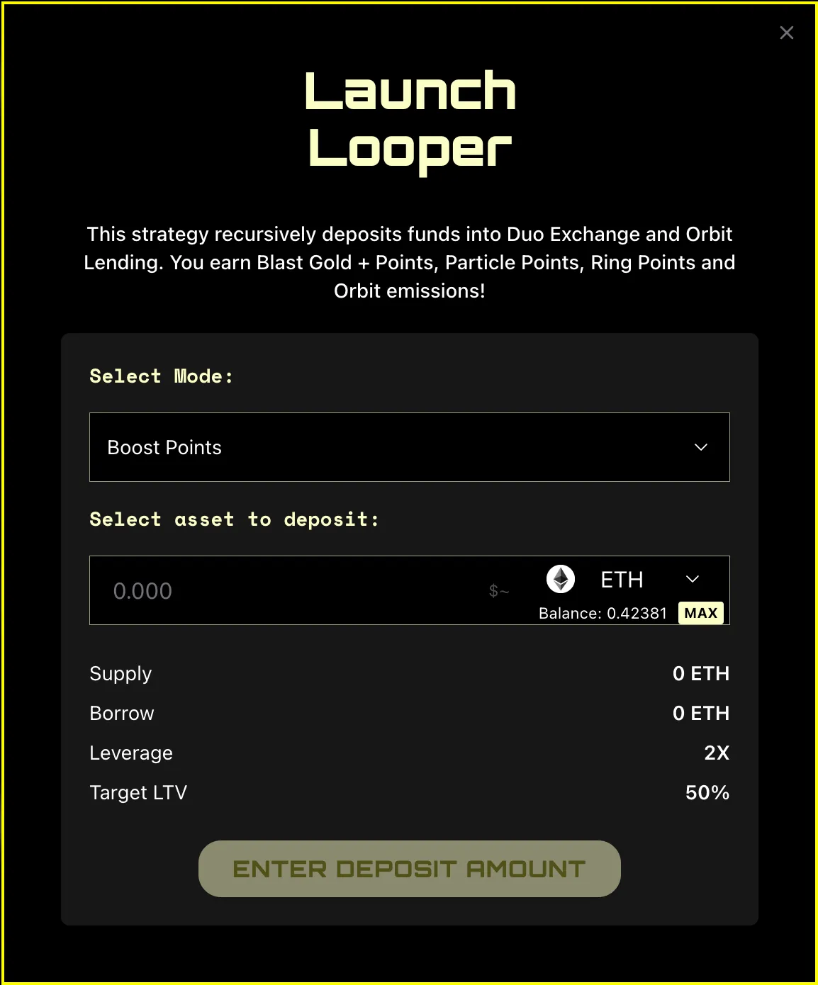 4. **Launch Looper Strategy:** Launch the Looper Strategy. Select the mode and asset to deposit.
